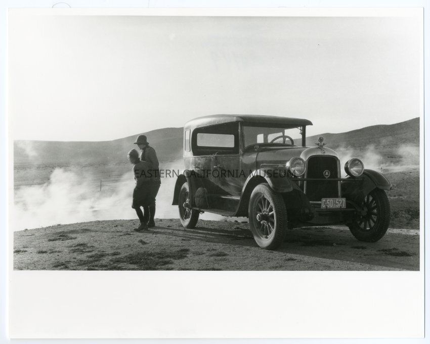 Black and white print of two people standing by a vehicle looking at steam rising from the ground. Likely Coso Hot Springs region. On reverse: "4449"