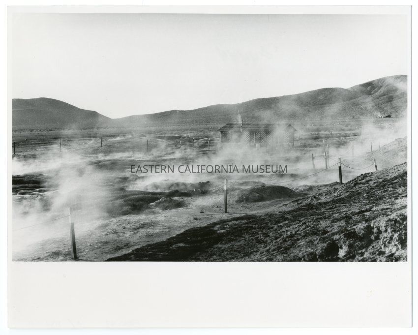 Black and white print of a structure and roped off areas where steam is rising from the ground. Likely Coso Hot Springs region. On reverse: "4444"