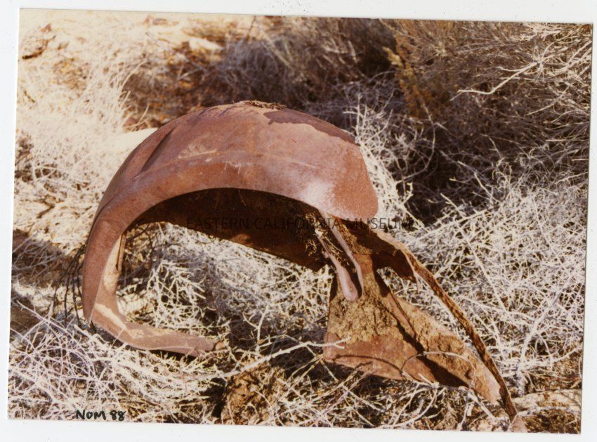 Color photo of the remains of a vehicle abandoned at Manzanar.Photograph Details