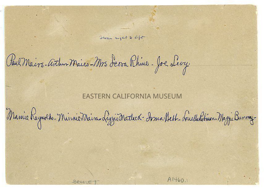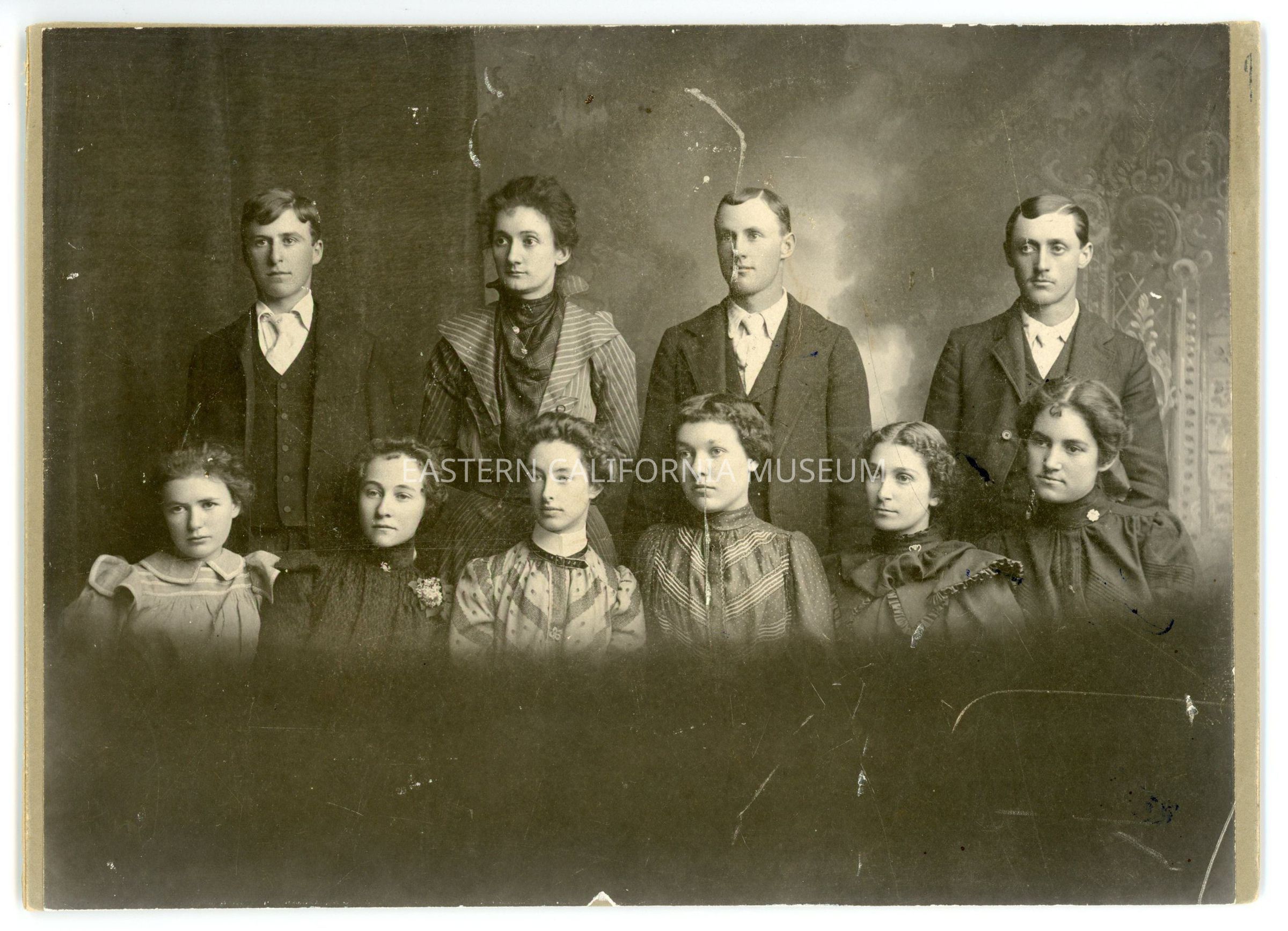Mounted studio portrait of a group of ten people arranged in two rows. From LtoR standing: Joe Levy, Leora Rhine, Arthur Mairs, and Paul Mairs. From LtoR sitting: Maggie Bunney, Louella Robinson, Irma Webb, Lizzie Matlack, Minnie Mairs, and Mamie Reynolds.Collection