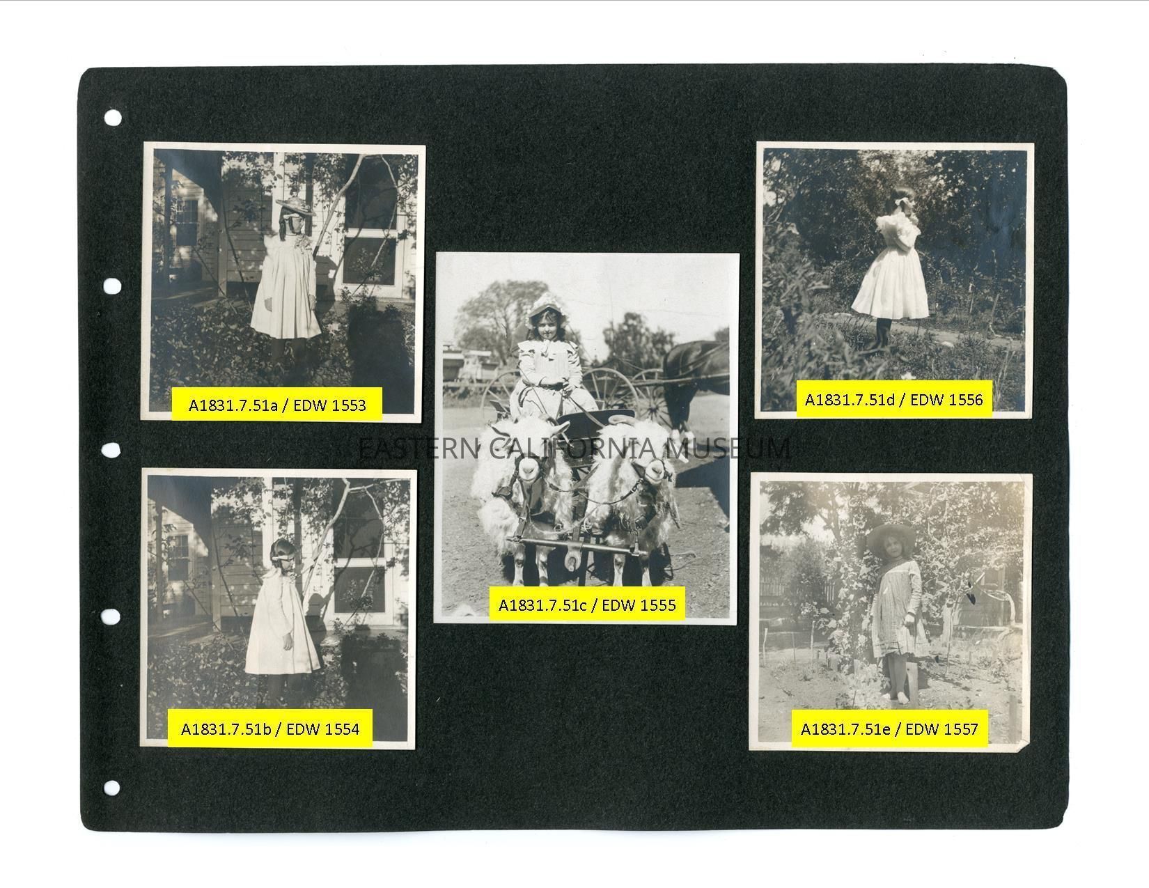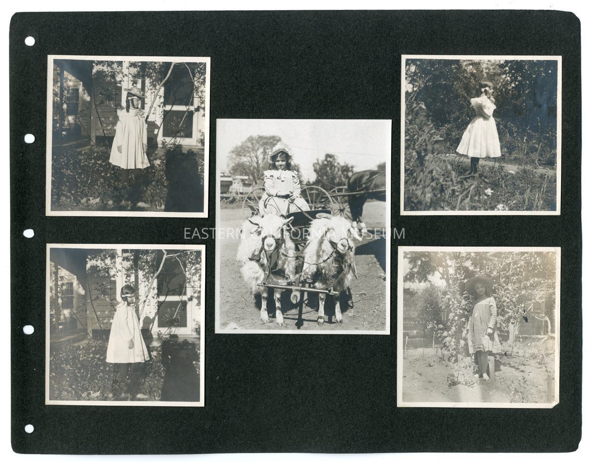 A1831.7.51c: Exterior photo of a young girl driving a miniature wagon pulled by two goats. Same image A1831.2.3b.