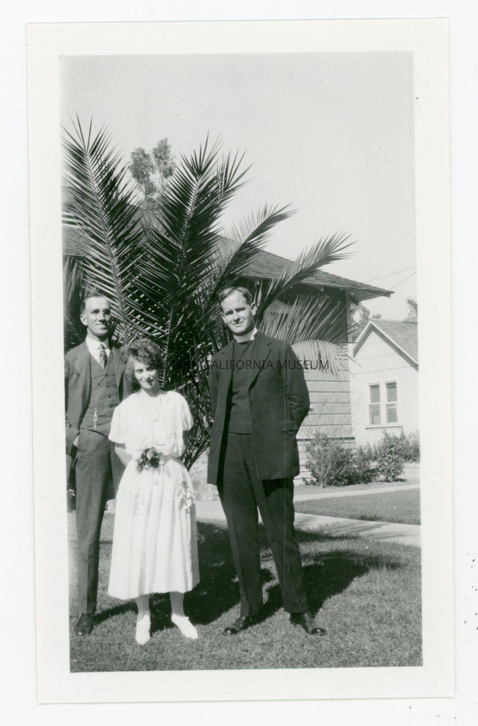 Copy of a photo of two men flanking a young woman in a white dress. They are standing on a grassy lawn in front of a palm-like tree and a house; location may be Southern California. The man on the right appears to be wearing a priest's collar.