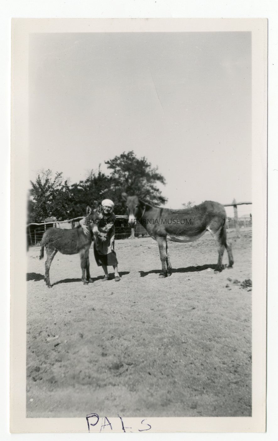 Photo of a woman hugging a fuzzy baby mule inside of a corral. Written in black ink along bottom edge is "Pals."