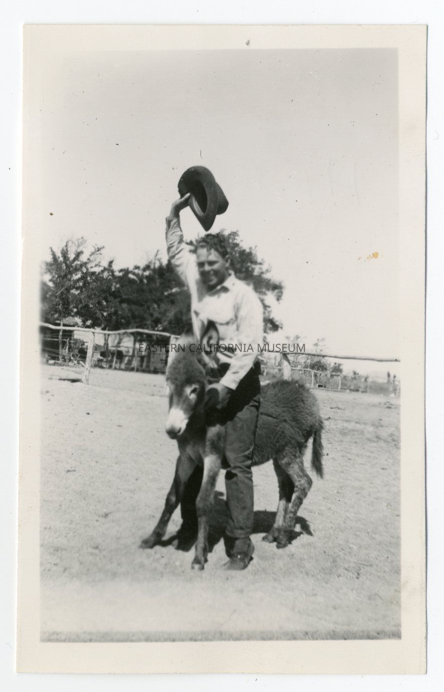 Photo of a cowboy pretending to ride a baby mule like a bucking bronco. He is waving his hat above his head. Written in blue ink on reverse: Herb Gorman.