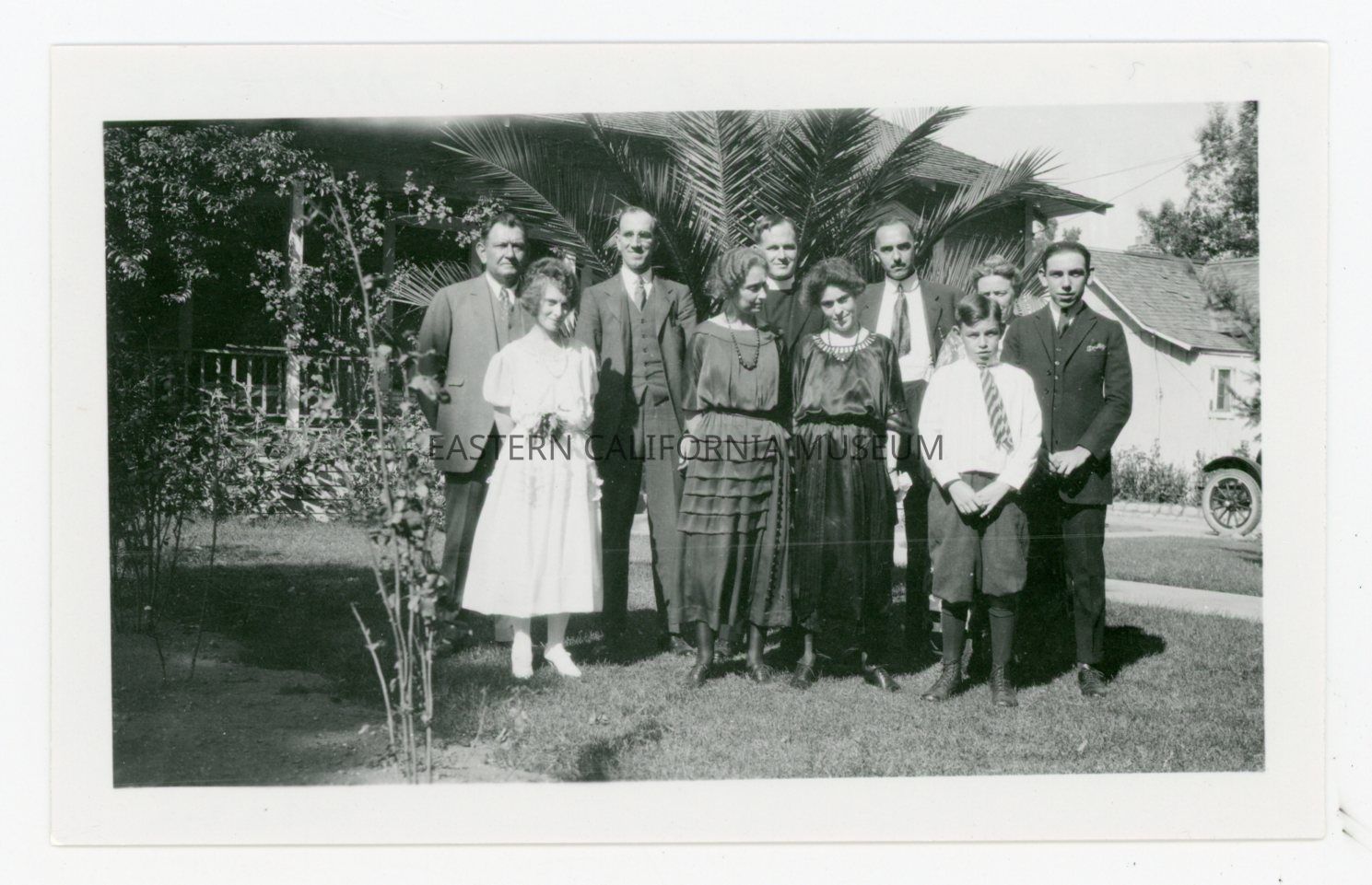 Copy of a photo of a group of ten people standing on a grassy lawn in front of a palm-like tree and a house; location may be Southern California.
