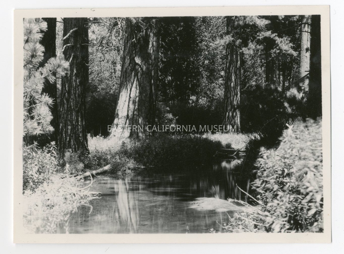 Photo of a placid creek or stream in a forest. Large trees along the banks. Location unknown.