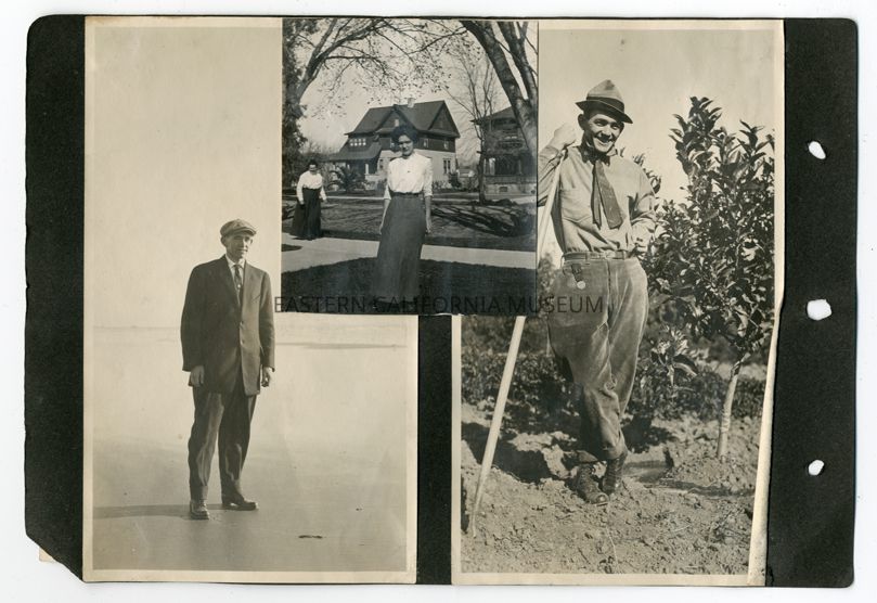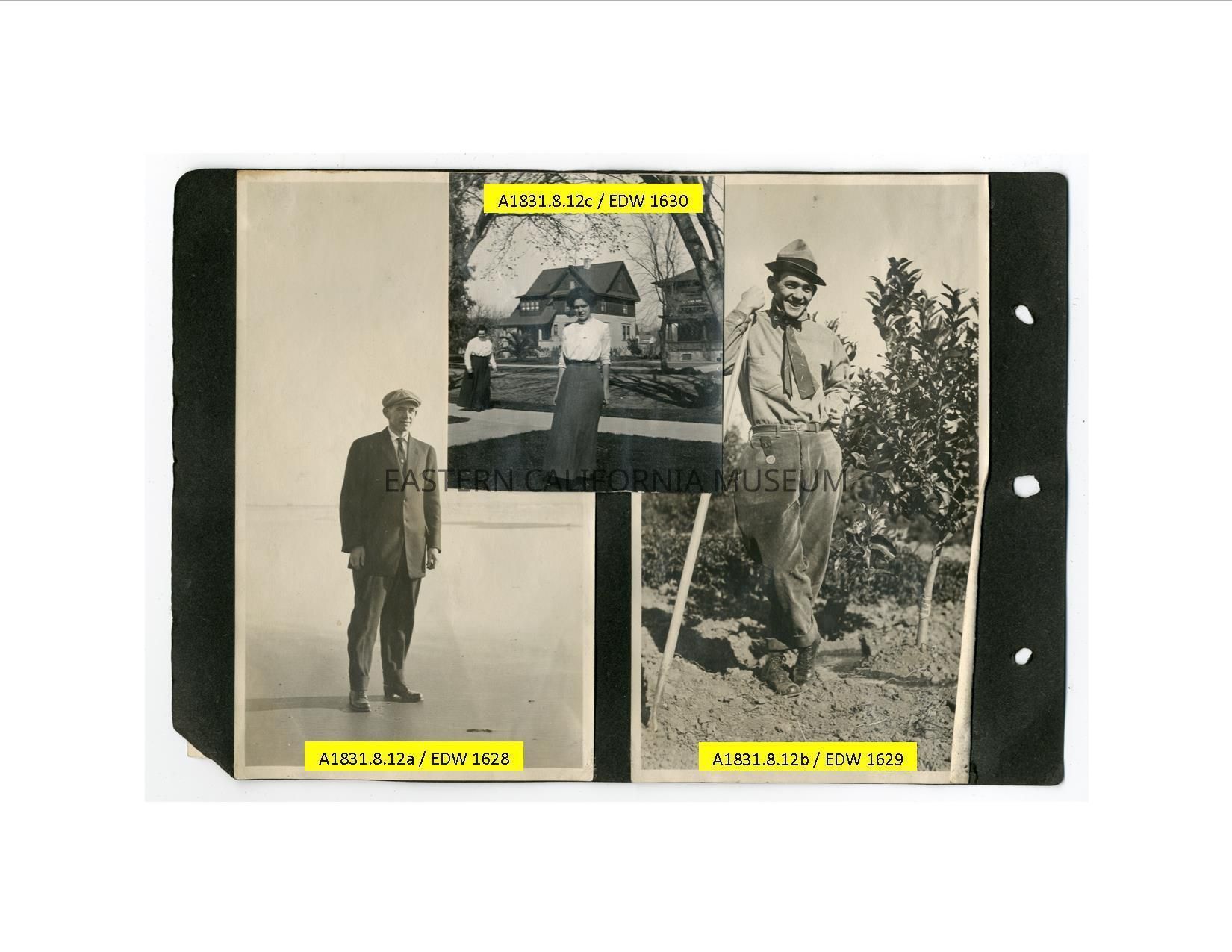 A1831.8.12b: Exterior photo of a man leaning against a garden tool. Behind him is a young tree.
