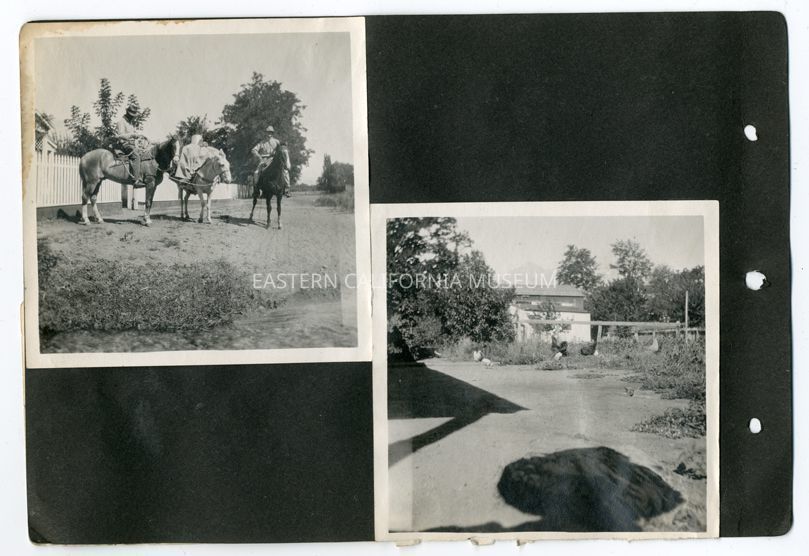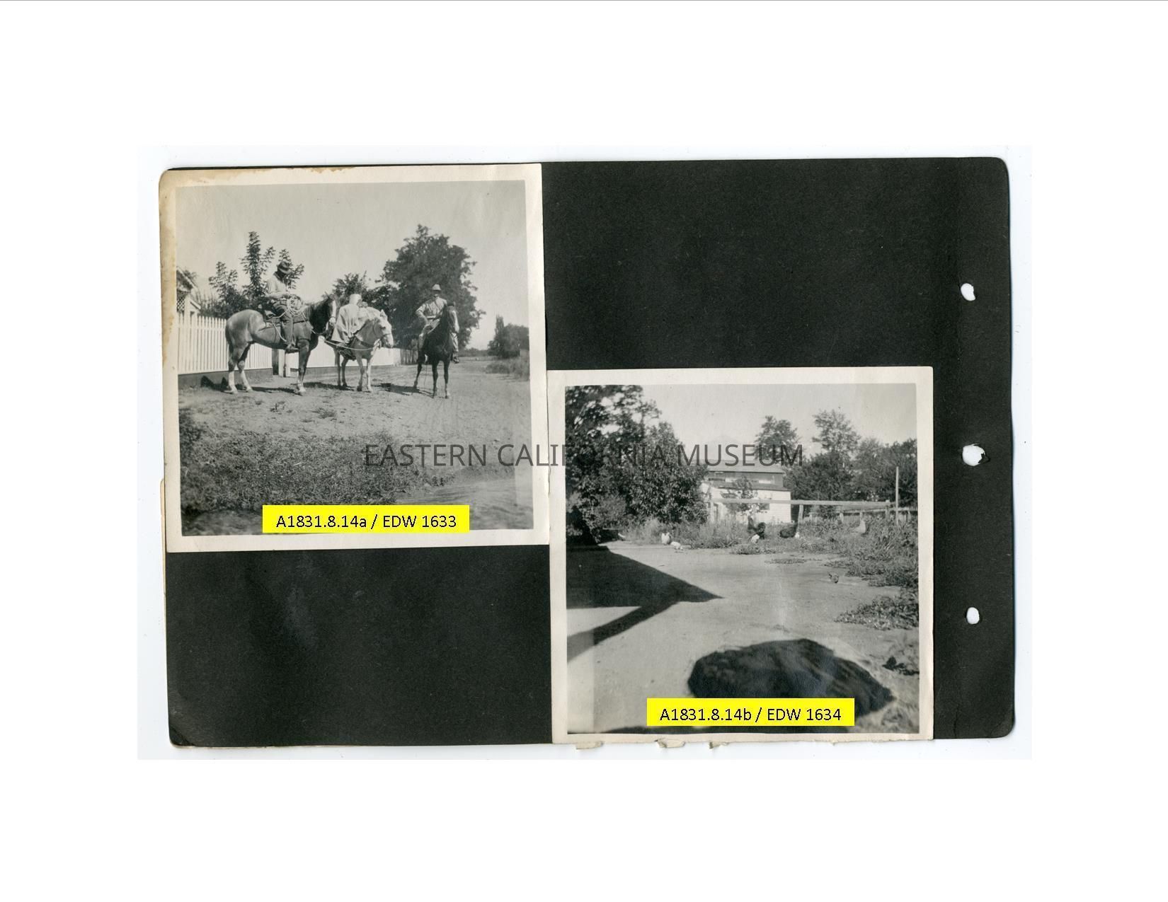 A1831.8.14a: Exterior photo of two men on horseback with a loaded up pack mule. A1831.8.14b: Exterior photo of chickens and a house.