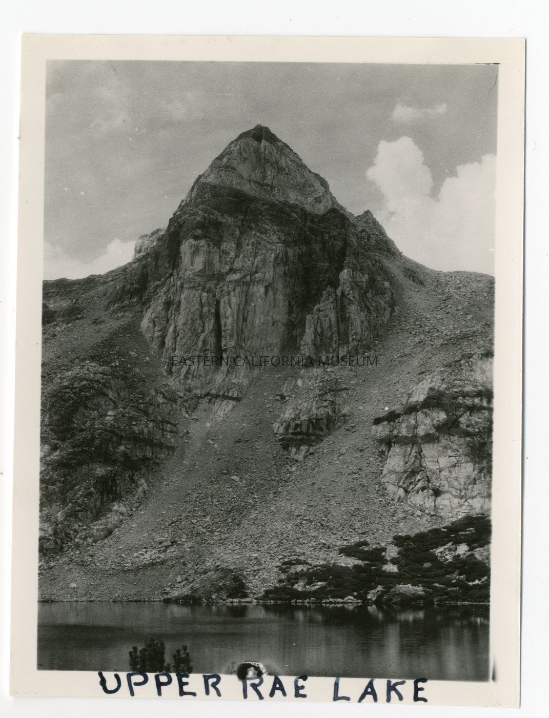 Photo of Fin Dome with a lake at its base. Written in black ink along bottom edge is "Upper Rae Lake."