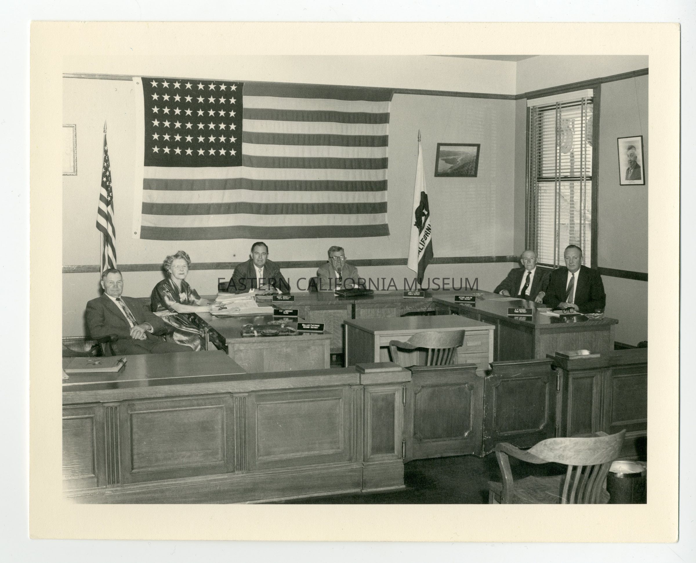 2024.0.226--Interior photo of the Board of Supervisors and Clerk Fay Lawrence. The Supervisors are Wallace Partridge (2nd District), Marty Sorrells (5th District), John Lubken (4th District), Arthur Barlow (1st District), and S. P. Keough (3rd District).