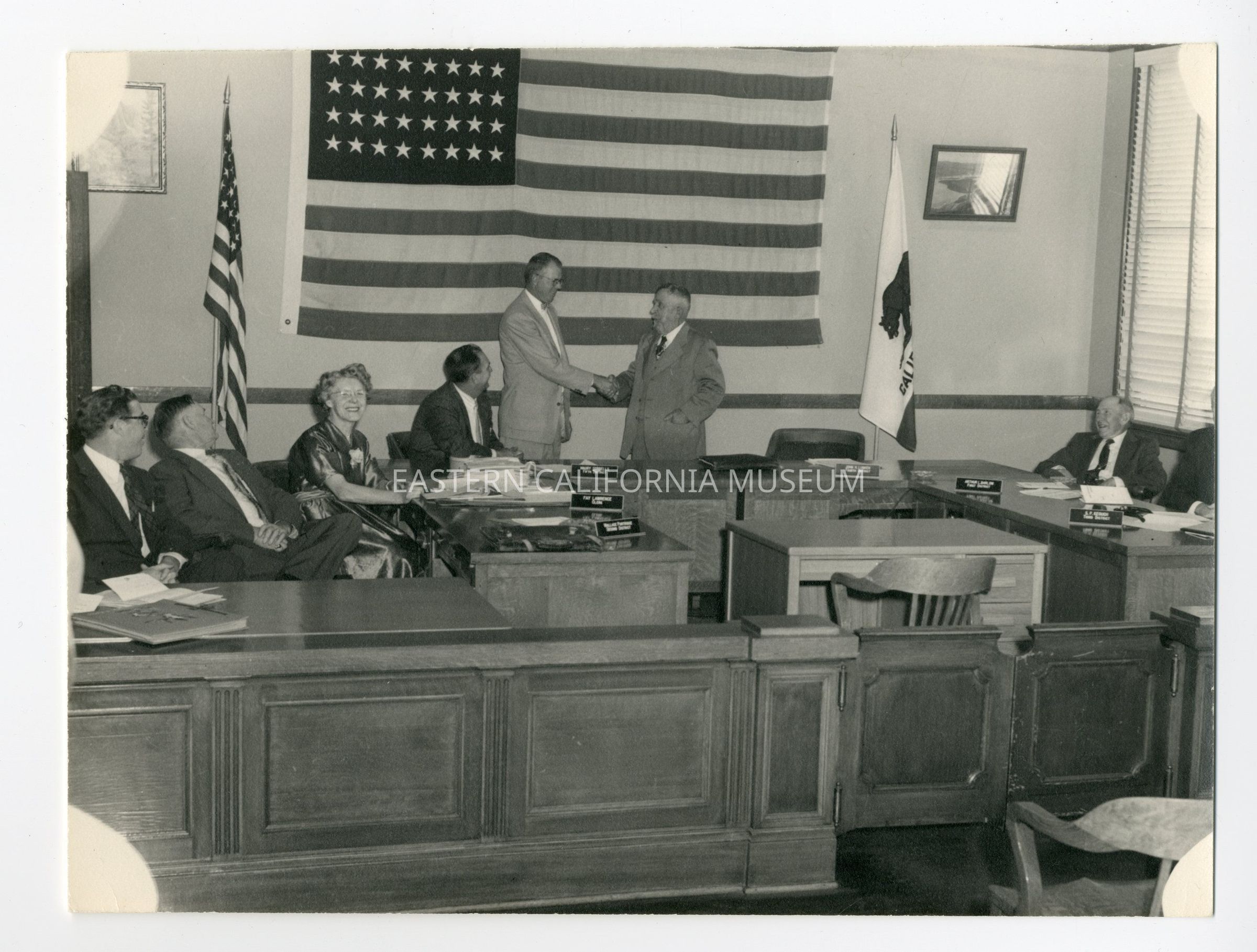 2024.0.227--Interior photo of the Board of Supervisors, Clerk Fay Lawrence, and two unidentified men. Two men are standing up in front of a large US flag shaking hands.