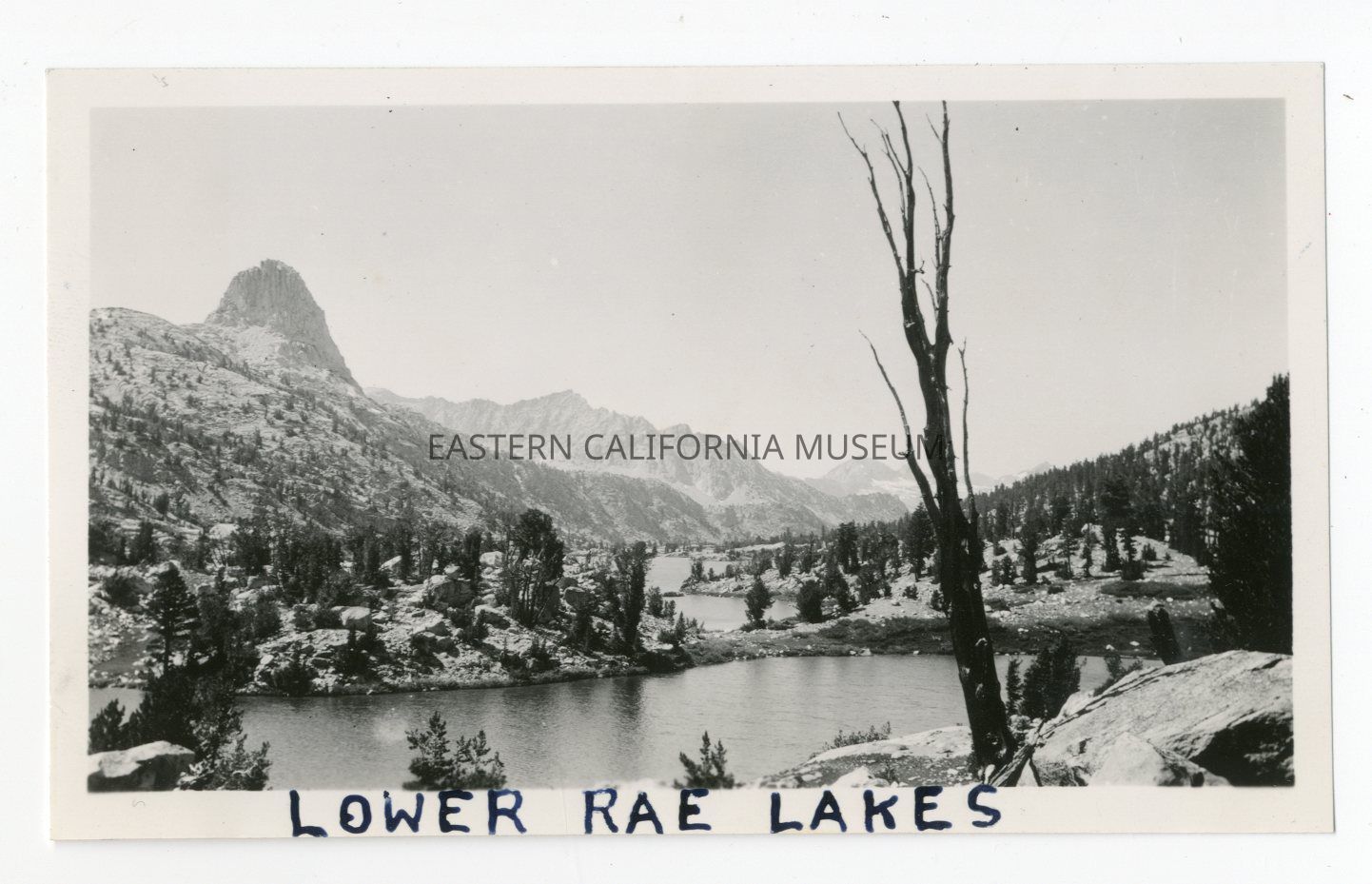 Photo of a mountain lake with Fin Dome in the background. There is a dead tree in the foreground. Written in black ink on the bottom edge is "Lower Rae Lakes."