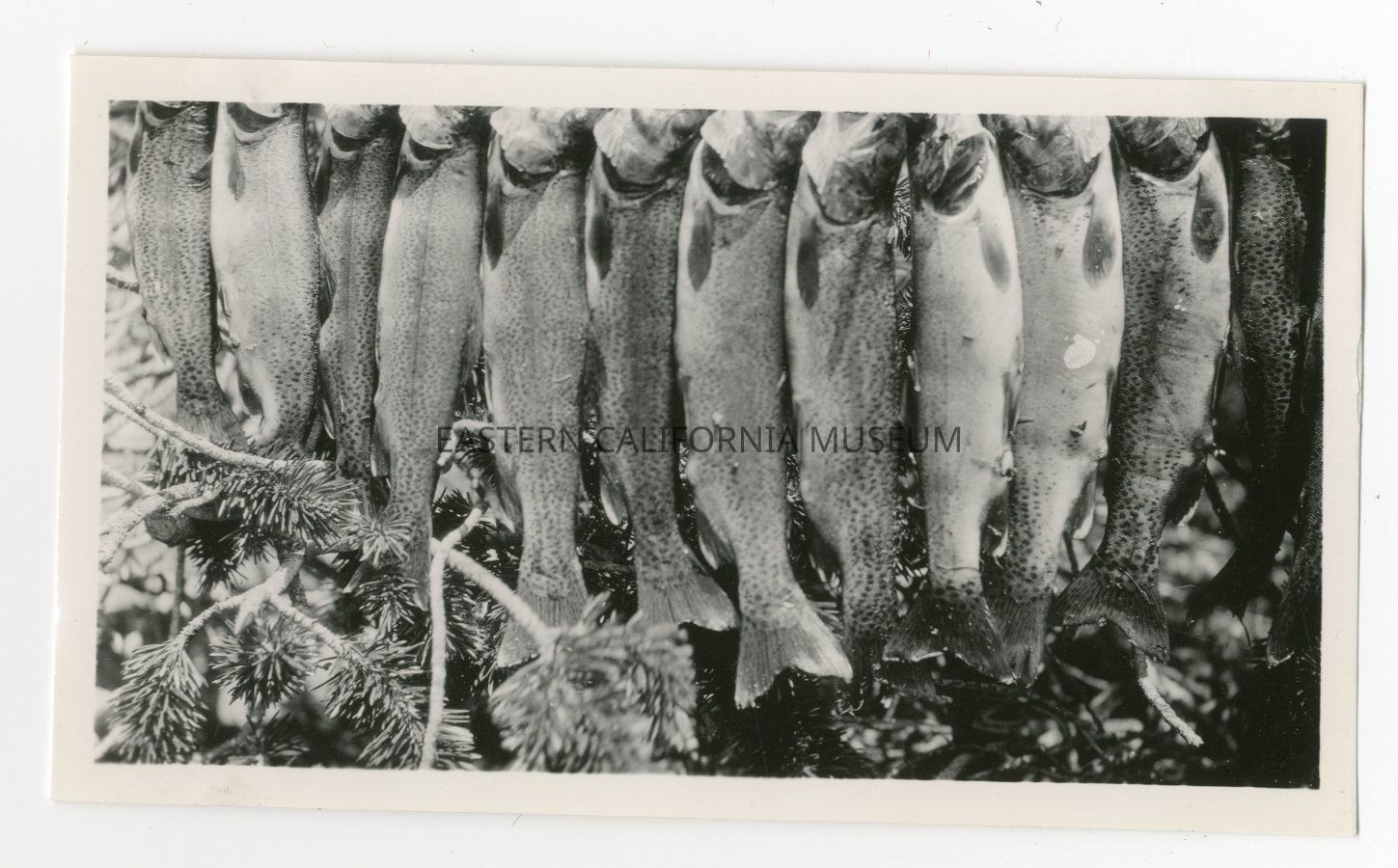 Photo of a dozen caught trout, possibly strung up on a stick.