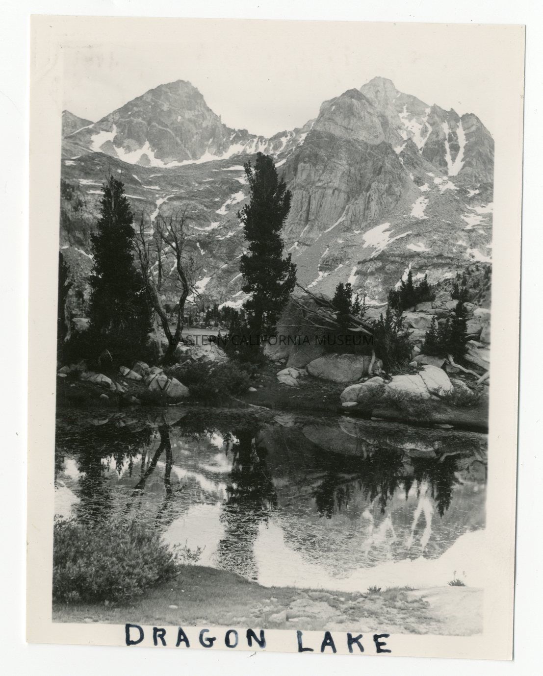 Photo of a small pond or creek reflecting the trees, rocks, and mountains in the background. Written in black ink along the bottom edge is "Dragon Lake."