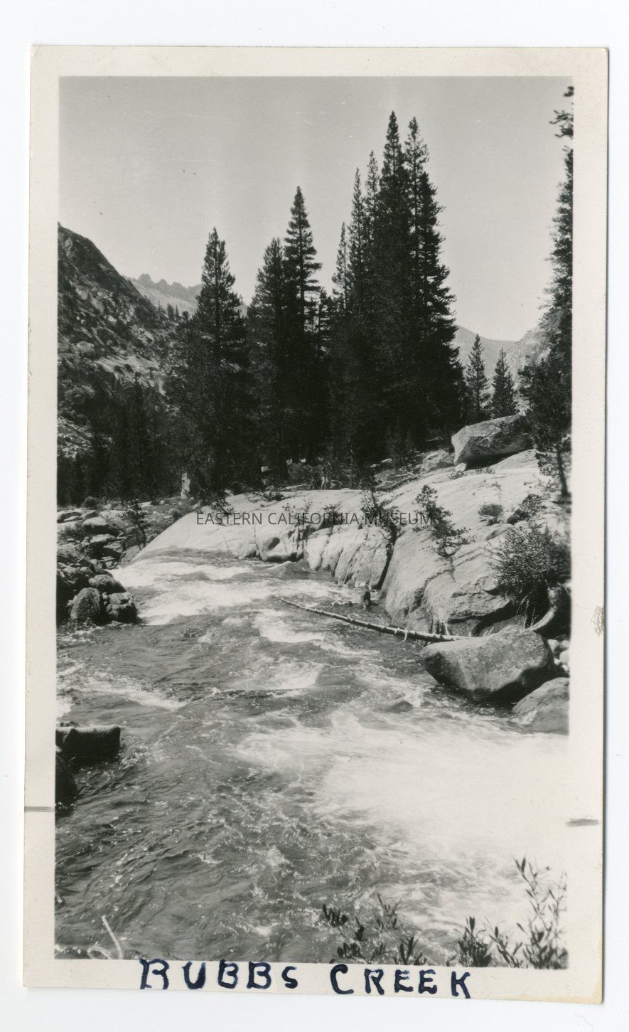 Photo of a river in the mountains. Written in black ink along bottom edge is "Bubbs Creek." Written in pencil on reverse: Bubb's Creek excellent trout stream near our pack station.