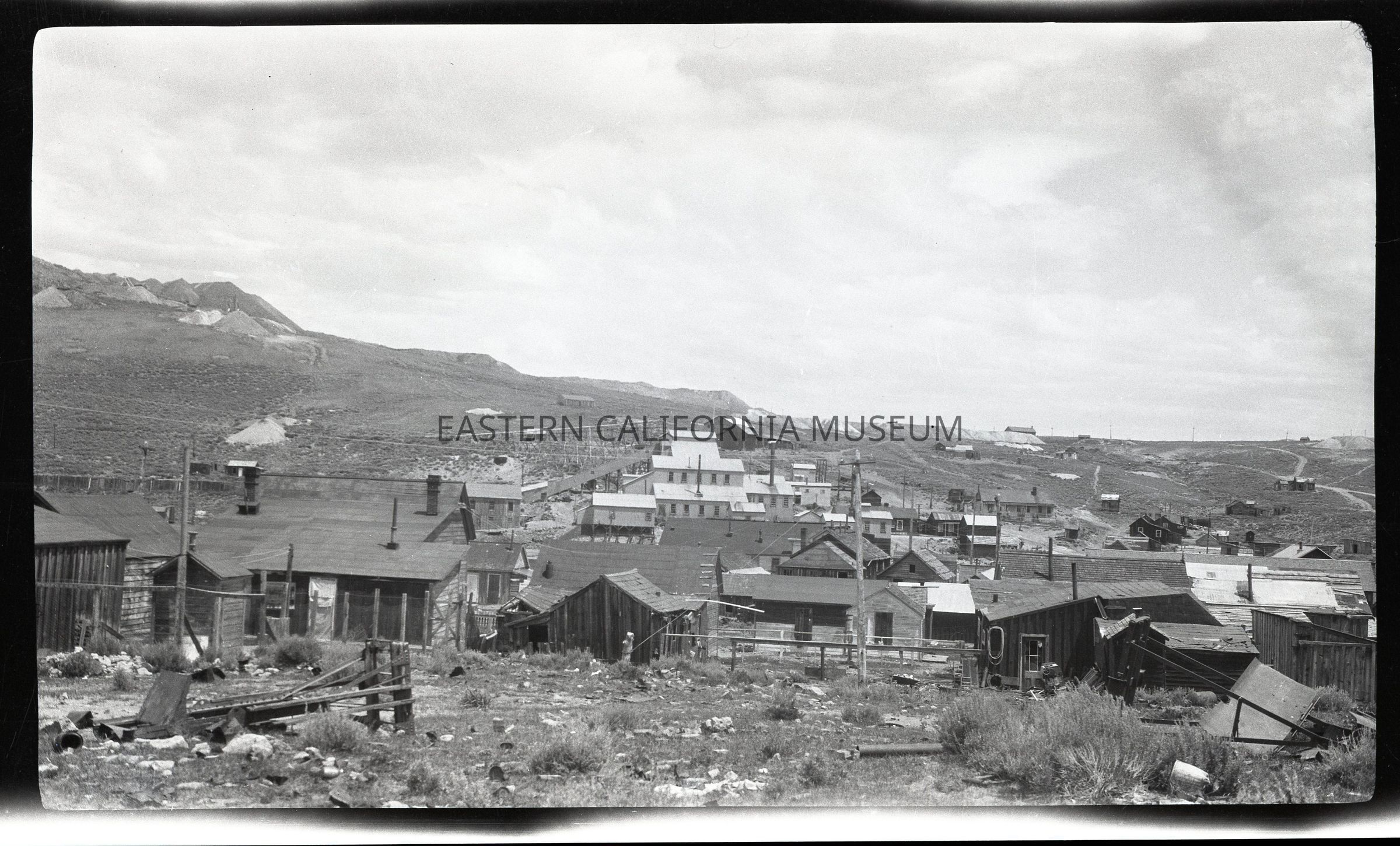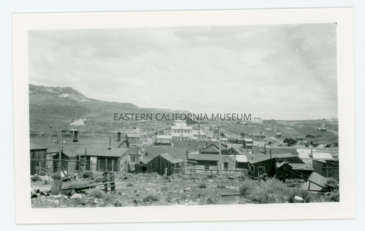 Copy of a photo of a run-down mining town with a mill in the back center. Date of photo may be circa 1923. Written on reverse: Bodie.