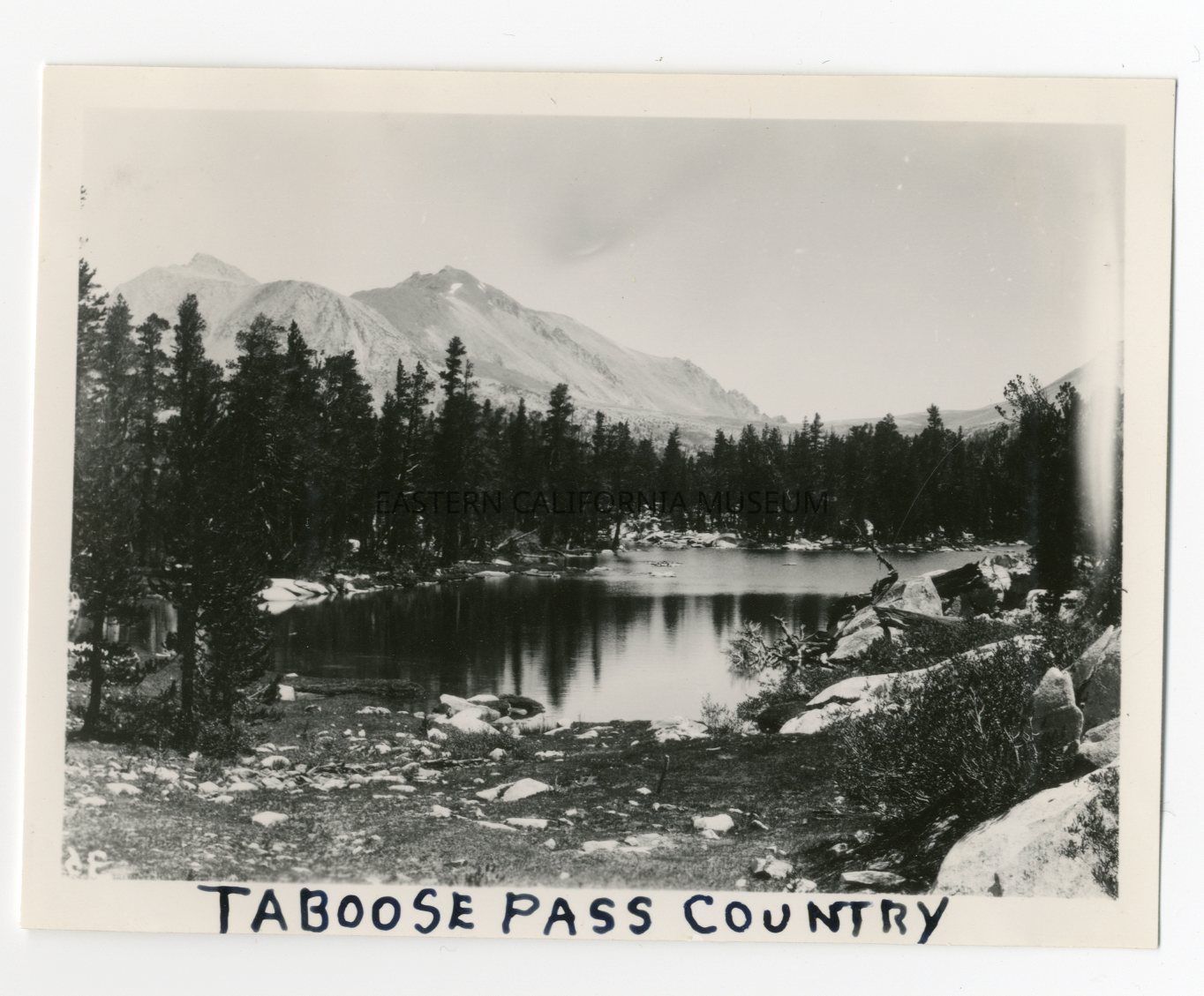 Photo of a lake ringed by trees with mountains in the background. Written in black ink along bottom edge is "Taboose Pass Country."