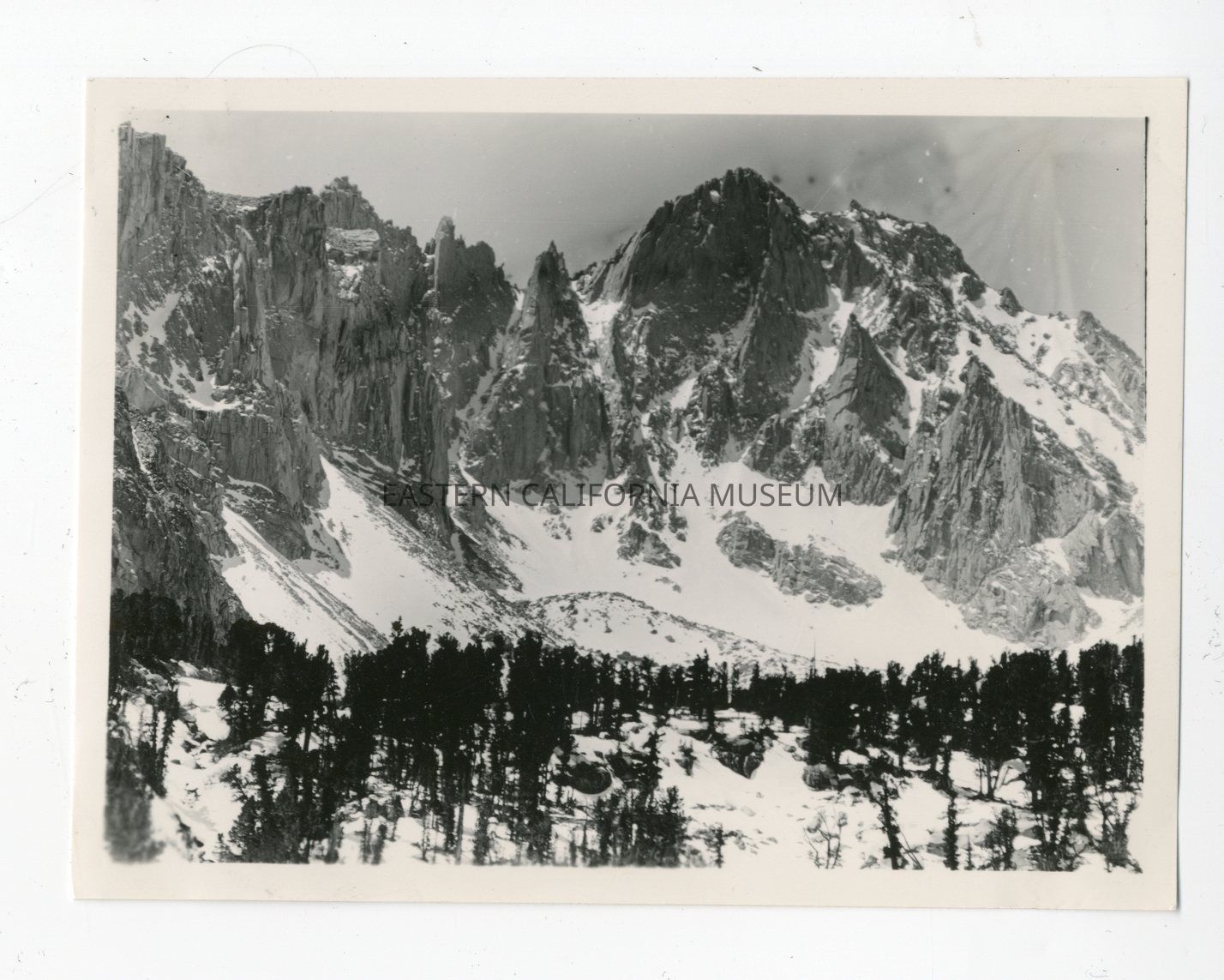 Photo of snow-covered rocky mountain peaks. Location unknown.