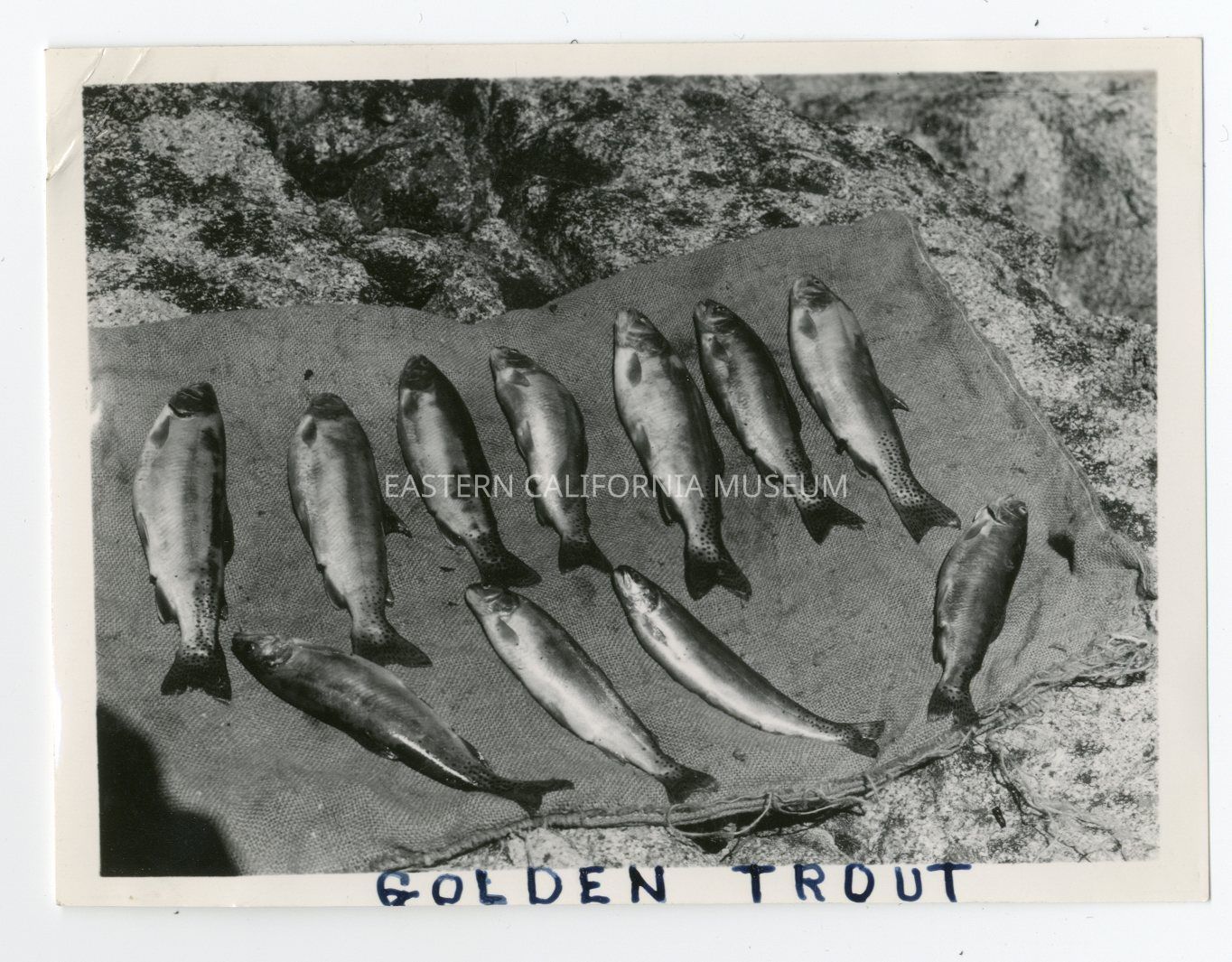 Photo of eleven caught trout laid out on what appears to be a burlap sack. Written in black ink along bottom edge is "Golden Trout."