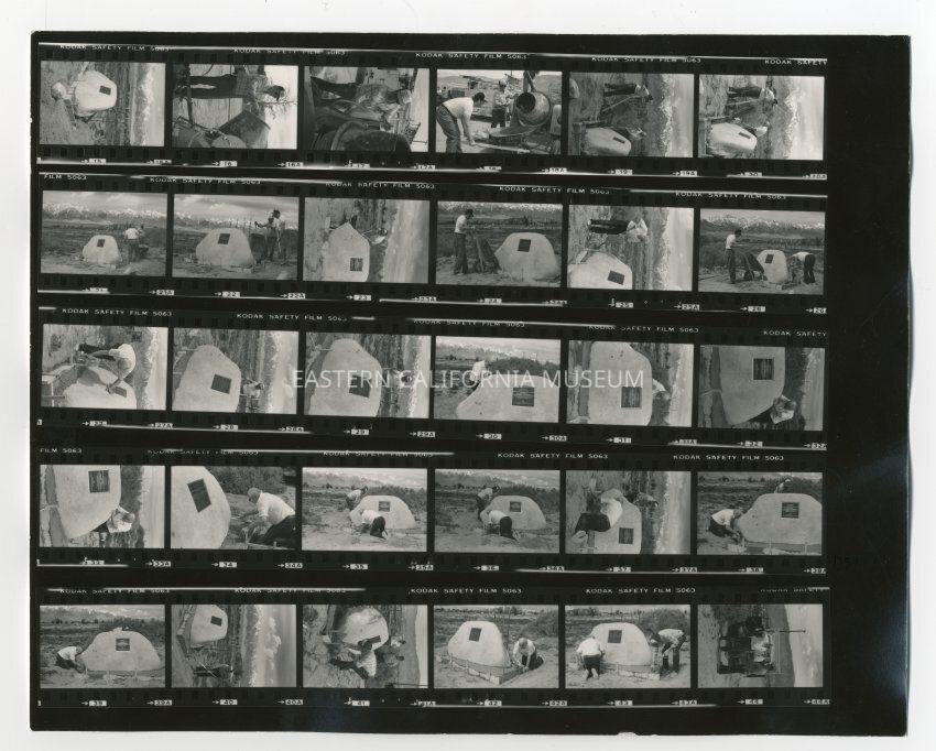 A second contact sheet of 30 black and white photos depicting the installation of the National Historic Landmark plaque at the historic entrance of the Manzanar site. Photos include installing plaque onto granite boulder, and installing boulder onto site at historic entrance. On the reverse of the contact sheet are several stamps indicating the photos are copyrighted by Dan Smith of Independence, CA.Photograph Details
