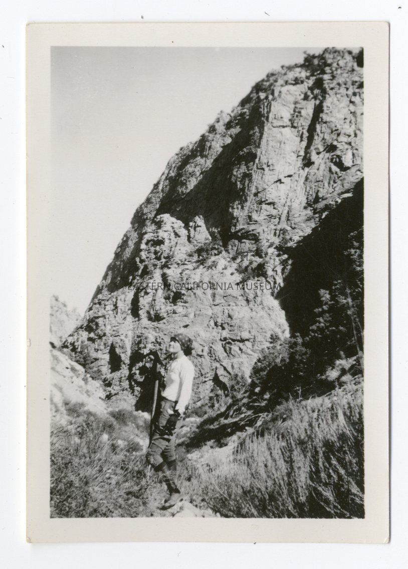 Photo of a person hiking. They appear to have a stick in their right hand. Location unknown.