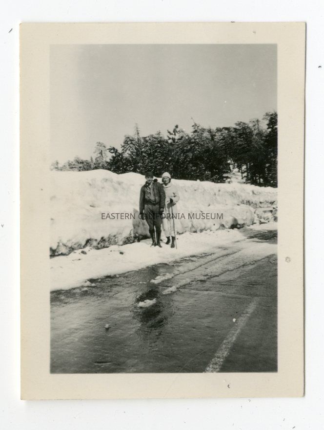 Photo of a man and a woman hiking alongside a snowbank that is up to their knees. They are walking on a paved road. She is holding a walking stick. Location unknown.