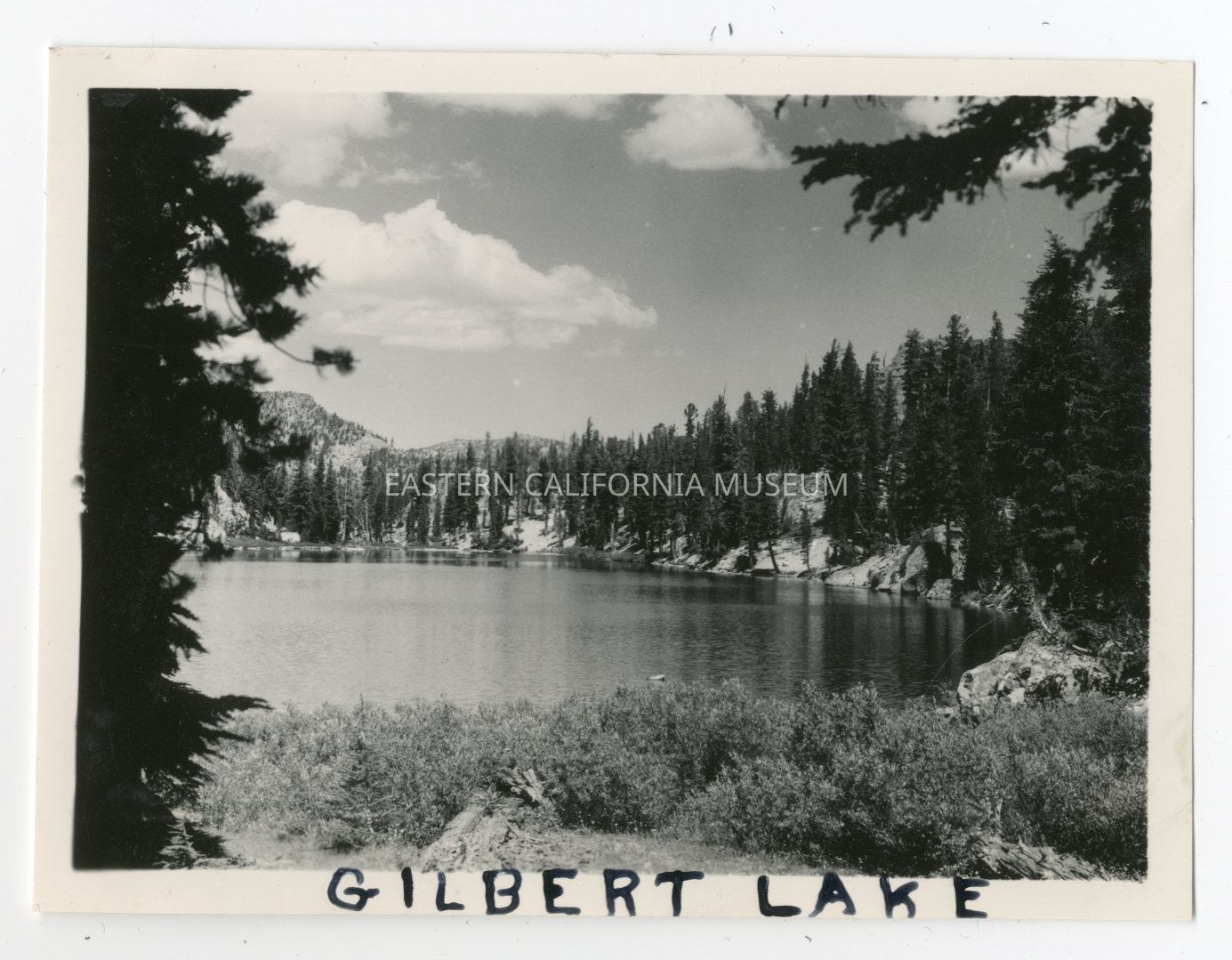 Photo of a lake ringed with trees. There are low shrubs in the foreground close to the lake's edge. Written in black ink along bottom edge is "Gilbert Lake."