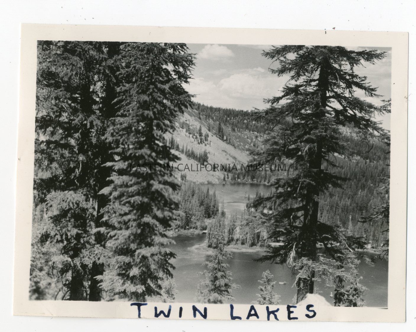 Photo taken from a high vantage point looking down at a lake or series of lakes. There are several trees in the foreground. Written in black ink along bottom edge is "Twin Lakes."