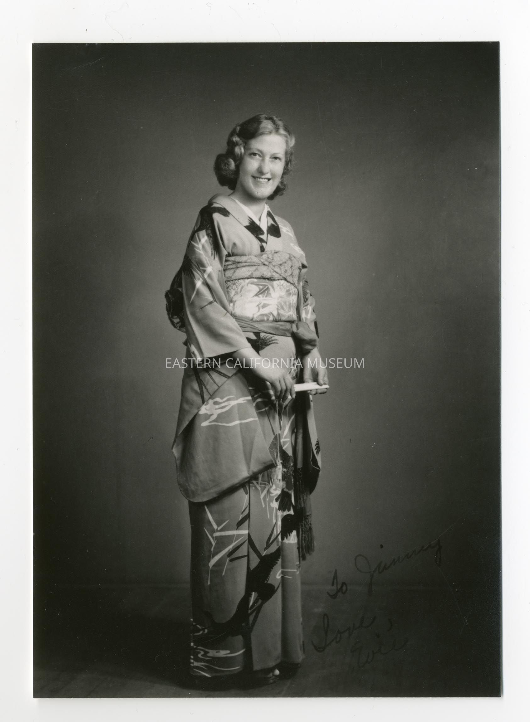 Studio portrait of Eve Beekman, teacher at Manzanar War Relocation Center, in a kimono or yukata. Written on the photo is, "To Jimmy, Love Evie."Collection