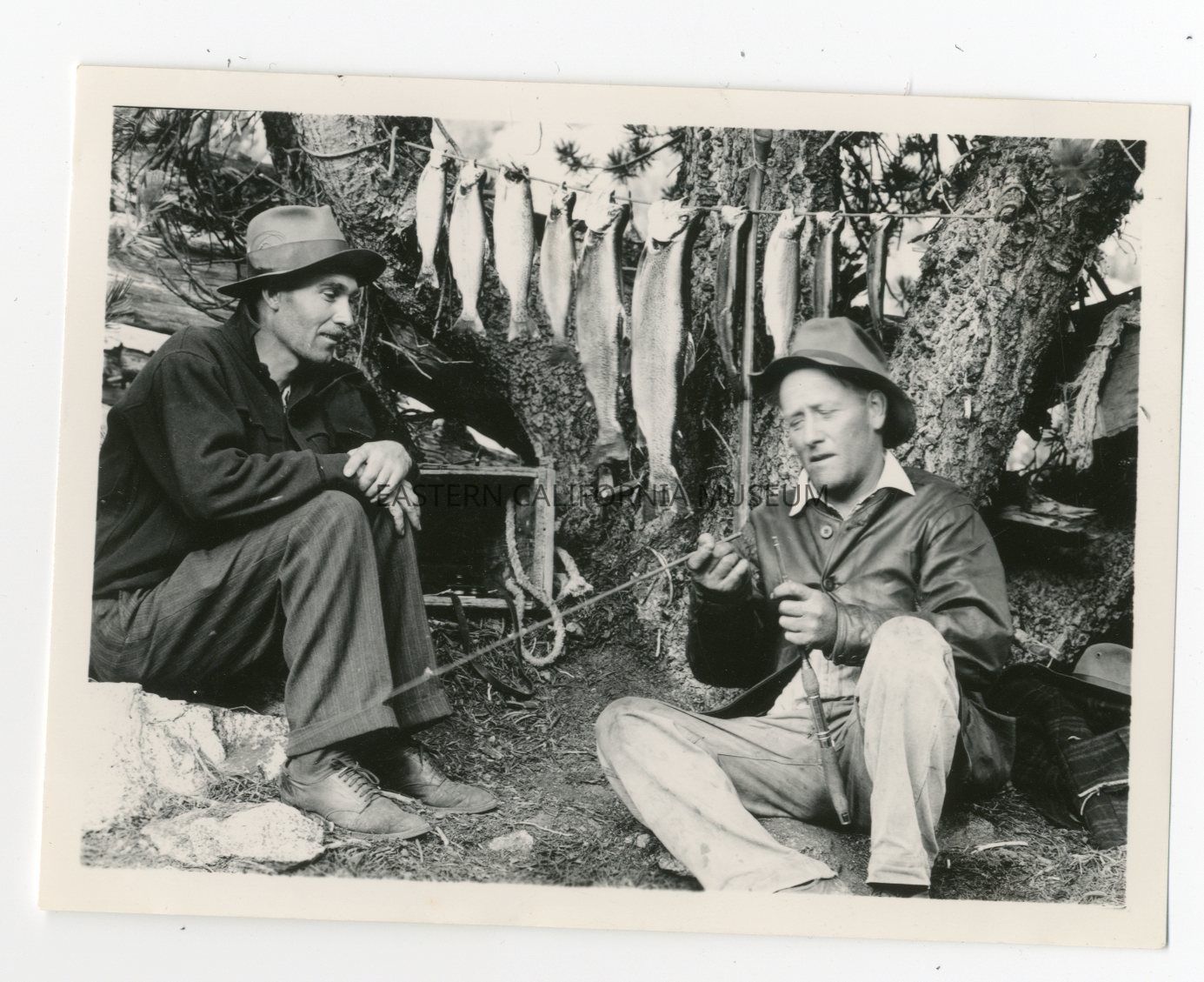 Photo of two men sitting at the base of a tree with a stringer of caught trout in the background. One man is dismantling a fishing pole.