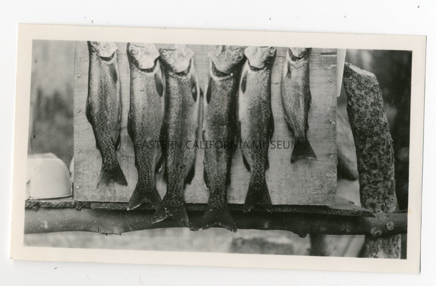 Photo of six caught trout. They are displayed against a man-made wood board--likely at a campsite. It is the same photo as 2024.0.346 or very similiar.