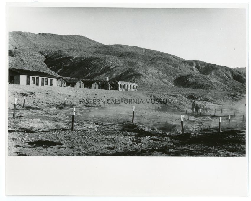 Black and white print of a row of structures (one is made of stone) with roped off steaming areas in the foreground. Two blurred figures are walking through the steamy area. Likely Coso Hot Springs region.