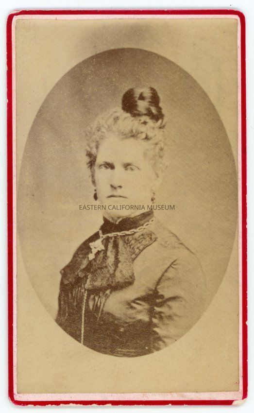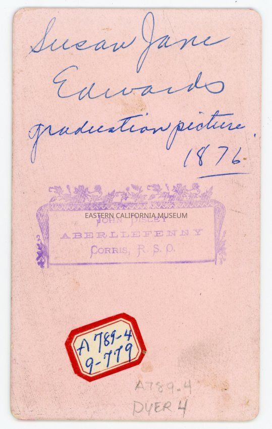 Mounted studio portrait of Susan Jane Edwards. It was her graduation photo from 1876 and the photographer was John Disley, of Aberllefenny, Corris, R.S.O. The card is pink with a red border.