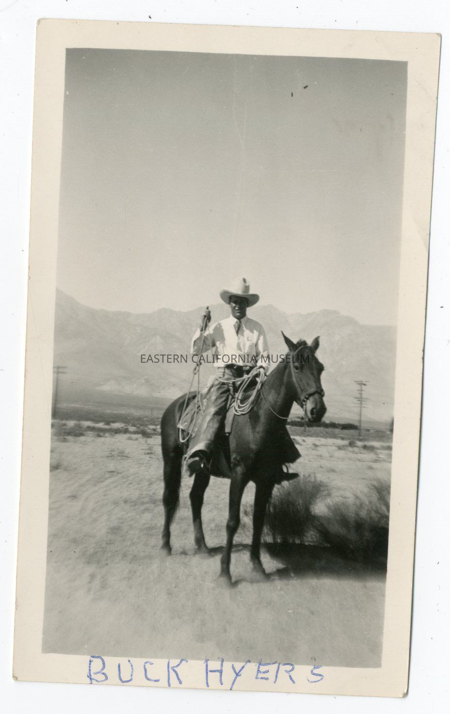 Photo of a man on horseback with the mountains in the background. There are also telephone poles in the background. Photo appears to have been taken from the Owens Valley. Written in blue ink on bottom edge is "Buck Hyers."