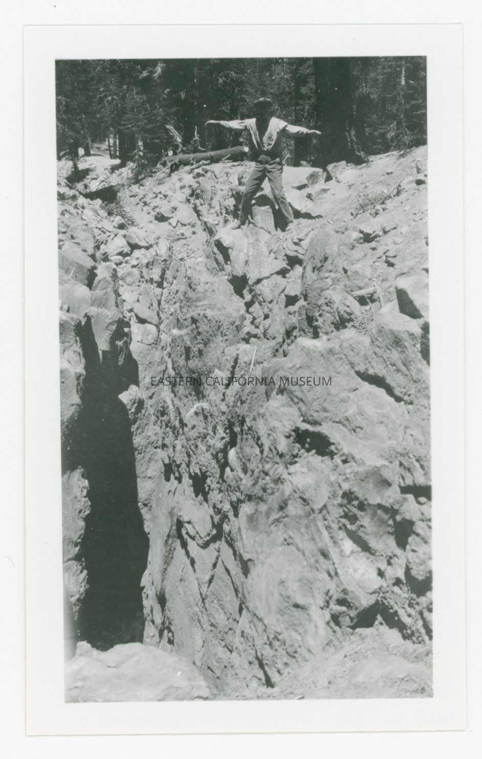 Copy of a photo of a man standing above an earthquake fault or fissure in Mono County. Date of photo may be circa 1923.