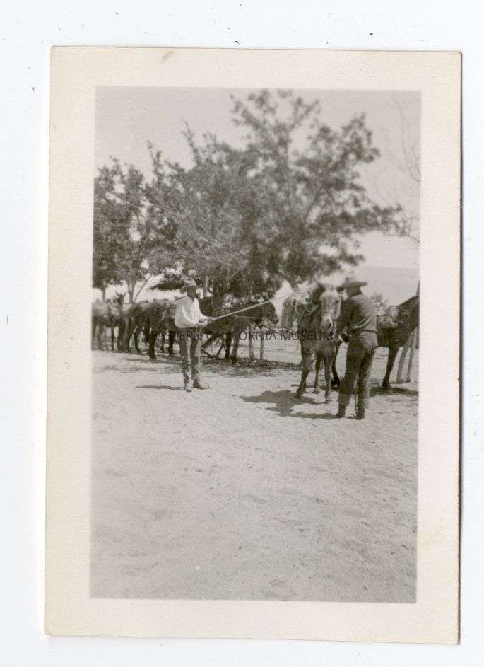 Photo of two packers loading up a mule. The rest of the pack train is behind them.
