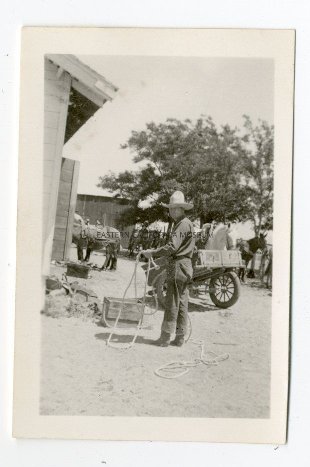Photo of an unidentified man wearing a white cowboy hat holding rope. Behind him is a small wagon, several saddled horses, and some buildings. Appears to be at a ranch or pack station.