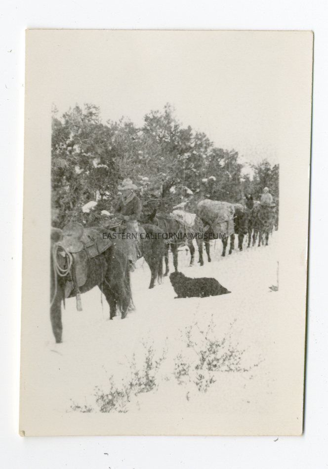 Photo of two people on horseback leading loaded mule pack train through the snow. There is a big black dog with them.
