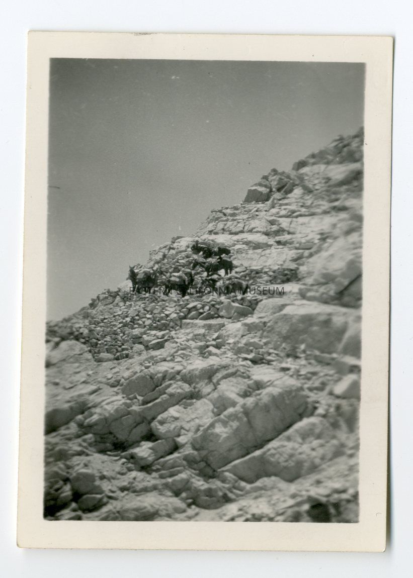 Photo of a mule pack train up on a rocky, exposed switchback.