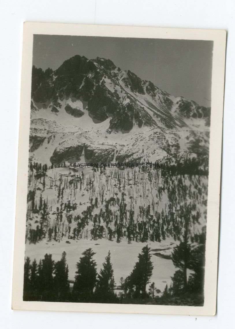 Photo of a snowy mountain scene. There appears to be either a frozen lake or meadow at its base. Location unknown.