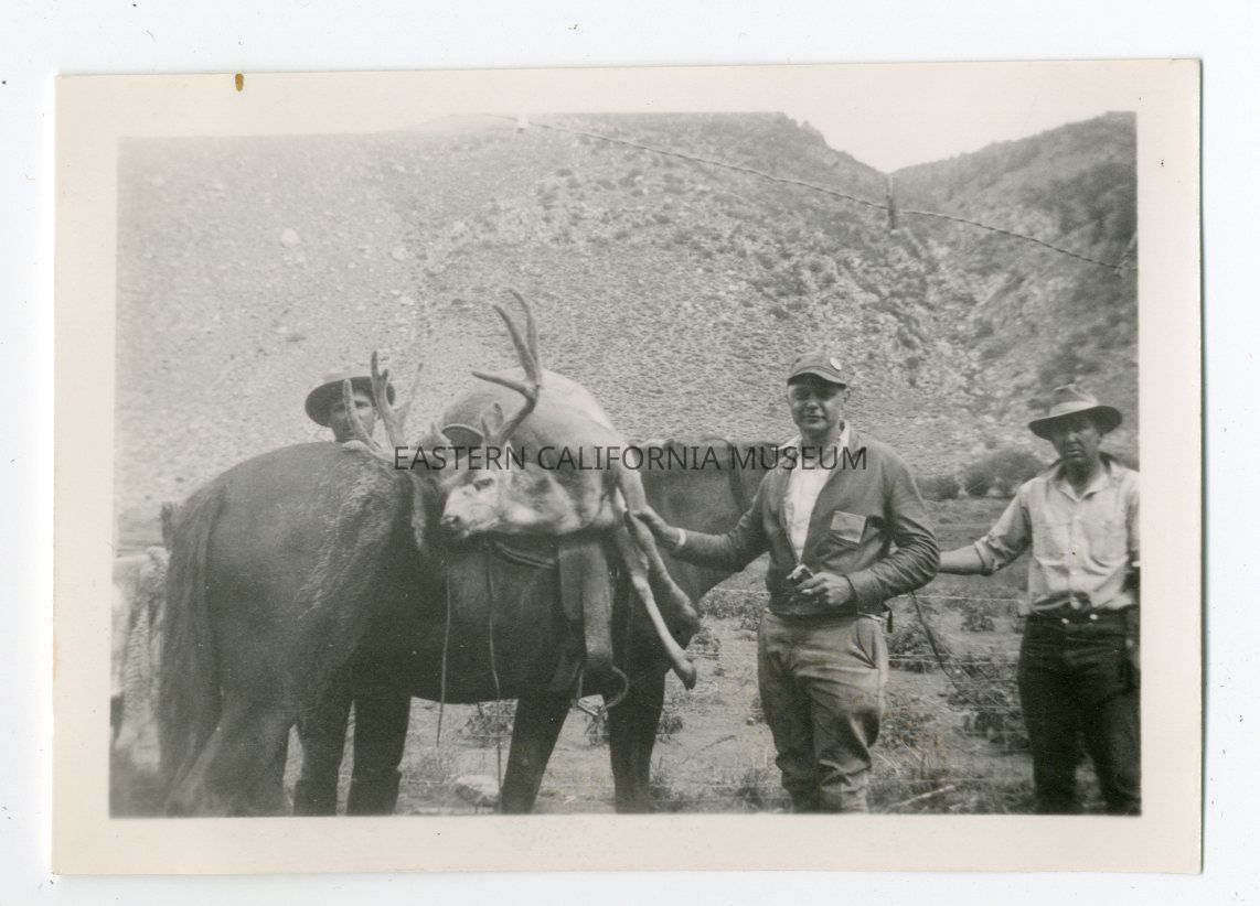 Photo of three men with a deer with antlers slung over the back of a horse.