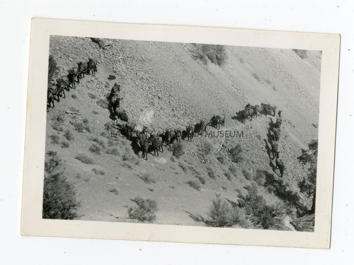 Photo of an extremely long pack train going up an exposed switchback.