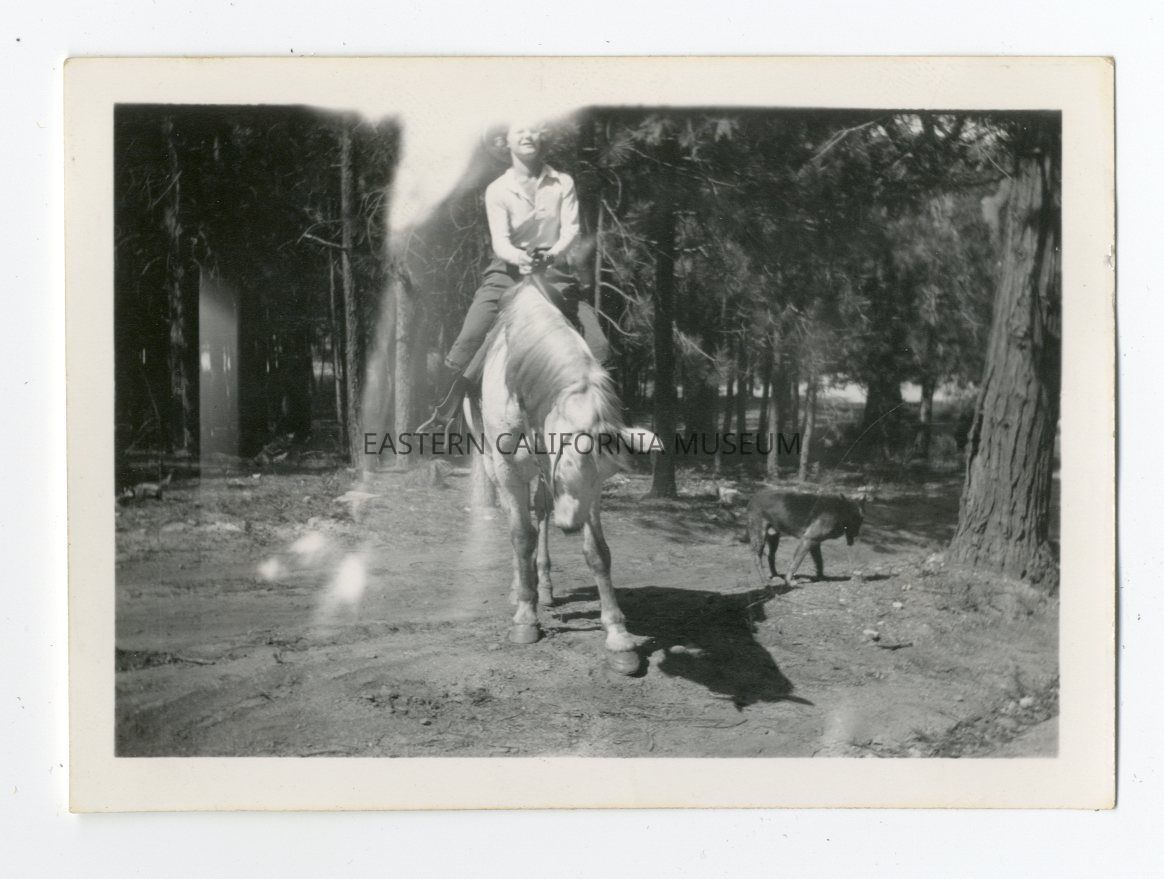 Photo of a woman on a white horse. There is a dog on the right side. She appears to be up in the mountains and is surrounded by trees.