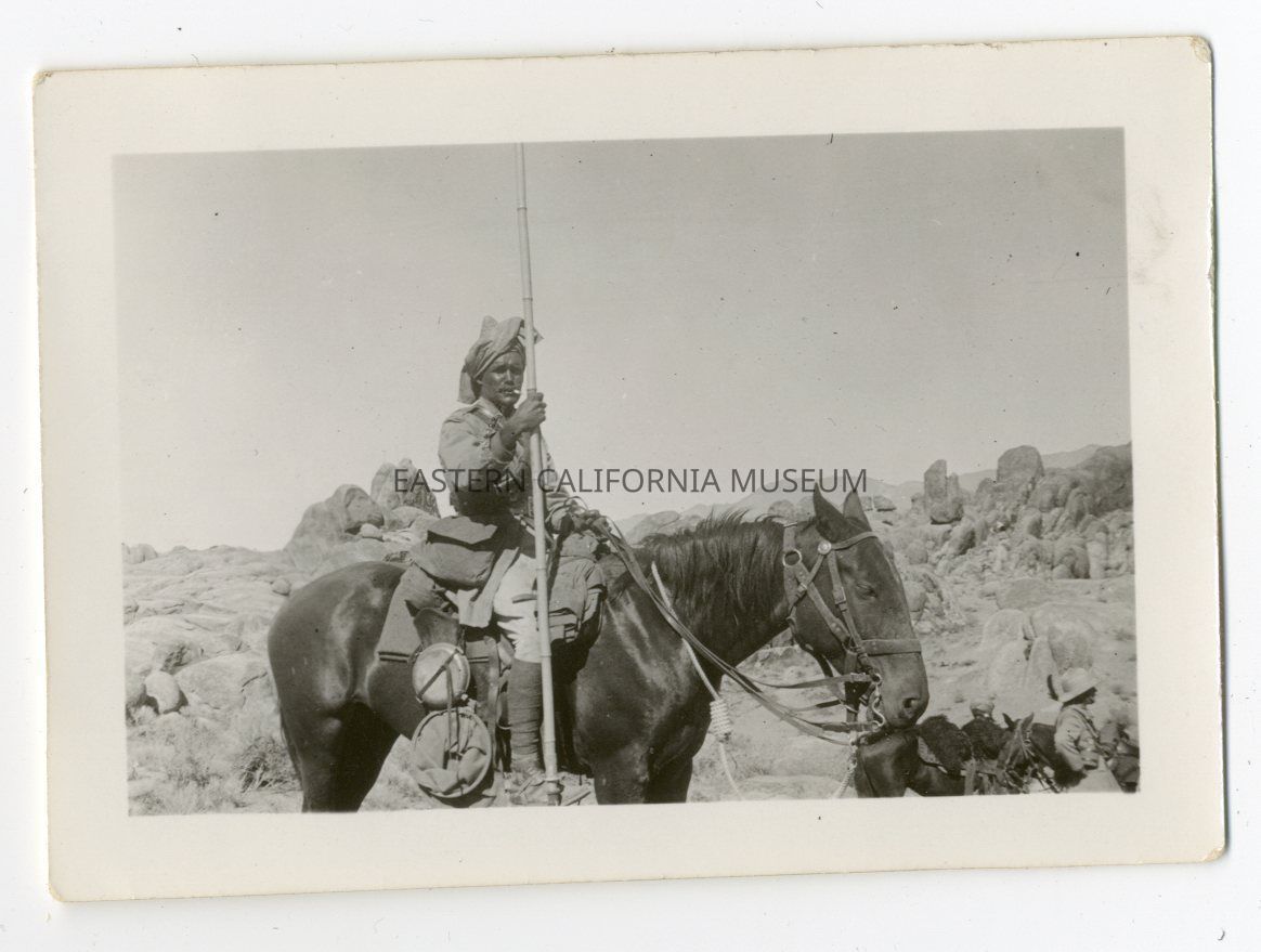 Photo of an actor on horseback wearing a costume military uniform. He is holding a long spear in one hand and may have a cigarette in his mouth. In the background are the distinctive rocks of Alabama Hills.