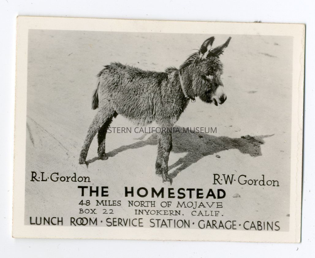 Photo of a baby mule or burro and below it an advertisement for "The Homestead." It was owned by R. L. Gordon and R. W. Gordon and was located 48 miles north of Mojave. It had a lunch room, service station, garage, and cabins.