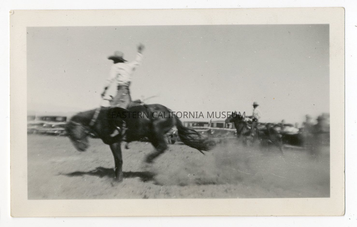 Blurry rodeo photo of a cowboy on a bucking black horse. There is a row of early vehicles parked behind him on the other side of a log fence. There is another man on horseback in the ring with him.