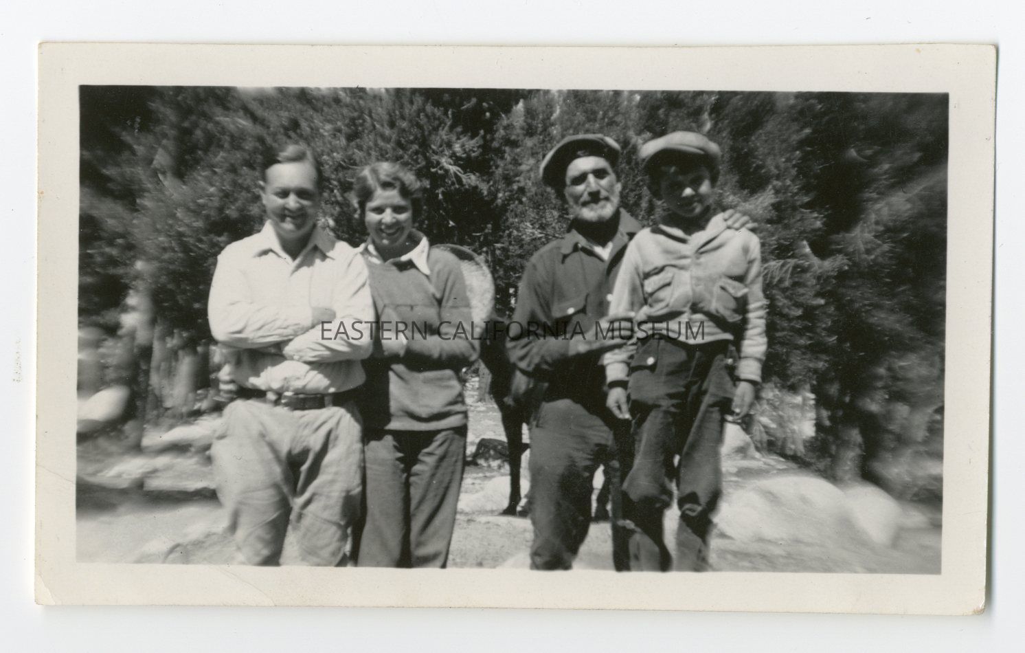 Photo of four people, possibly a family on a hiking trip. Two are a young/middle aged couple, then there is an older man and a young boy. There is a black horse barely visible in the background.