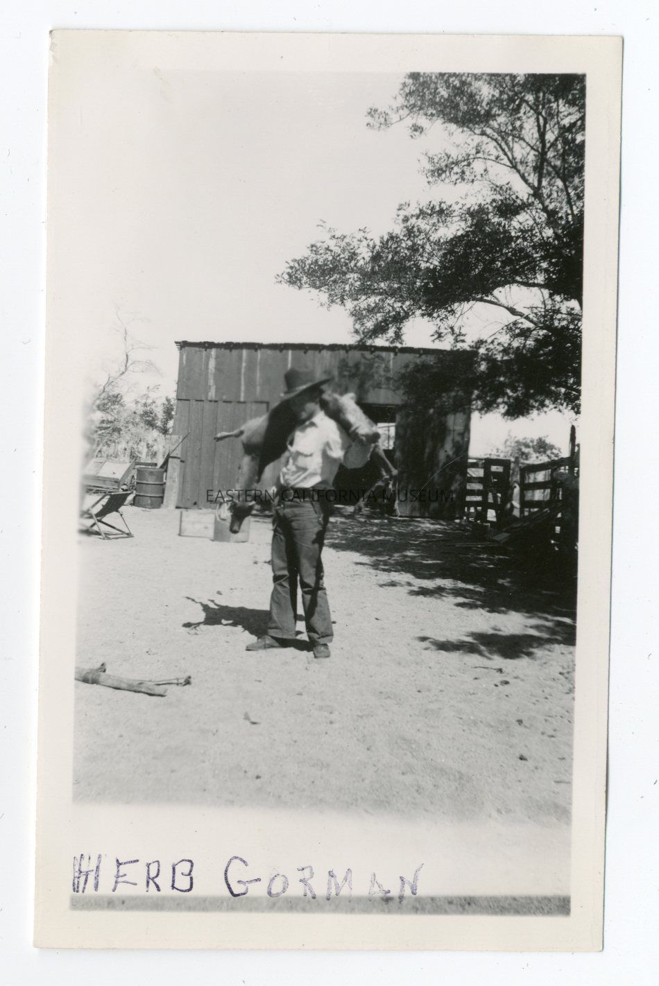 Photo of a man with a deer slung over his shoulders. Written in black ink along bottom edge is "Herb Gorman." There is a wooden shed or outbuilding behind him.