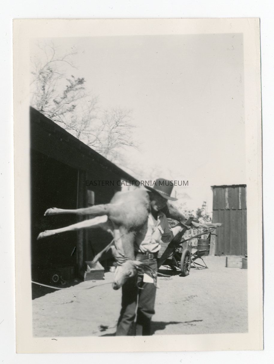 Photo of a man, likely Herb Gorman, with a deer slung over his shoulders. There is a wooden shed or outbuilding behind him.