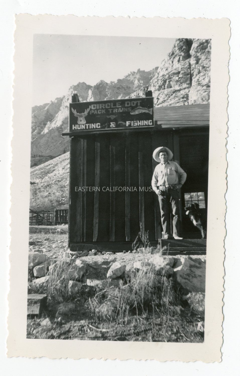 Photo of a man and dog standing in front of a wood shed or outhouse that has a sign advertising "Circle Dot Pack Trains, Hunting & Fishing." Written in pencil on reverse: Onion Valley.